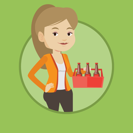 若い幸せな女がビールのパックを保持しています ビールのシックス パックを運ぶ女性の完全な長さ 白人笑顔の女性がビールを購入します ベクター背景に分離されたサークルでフラットなデザイン イラスト のイラスト素材 ベクタ Image